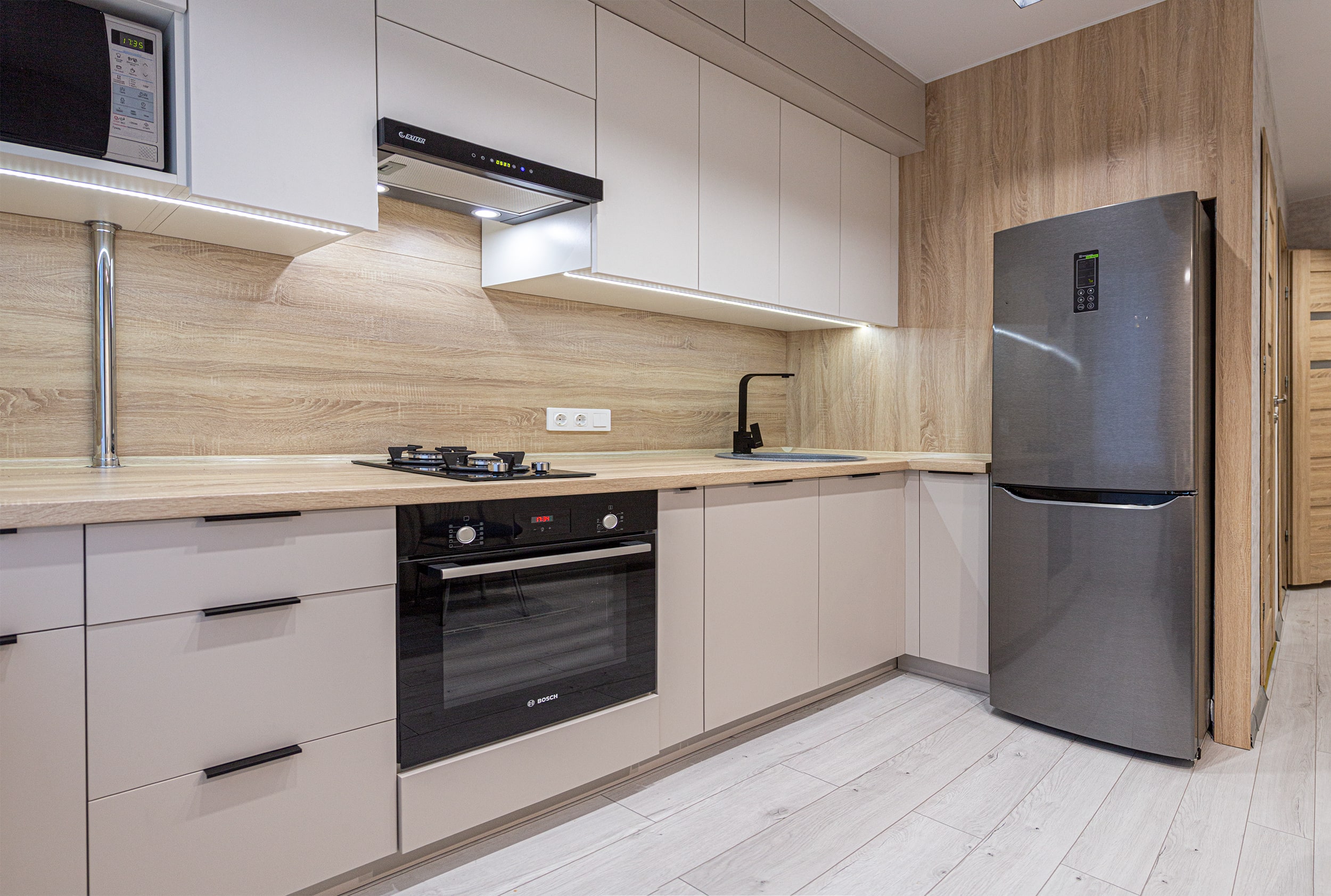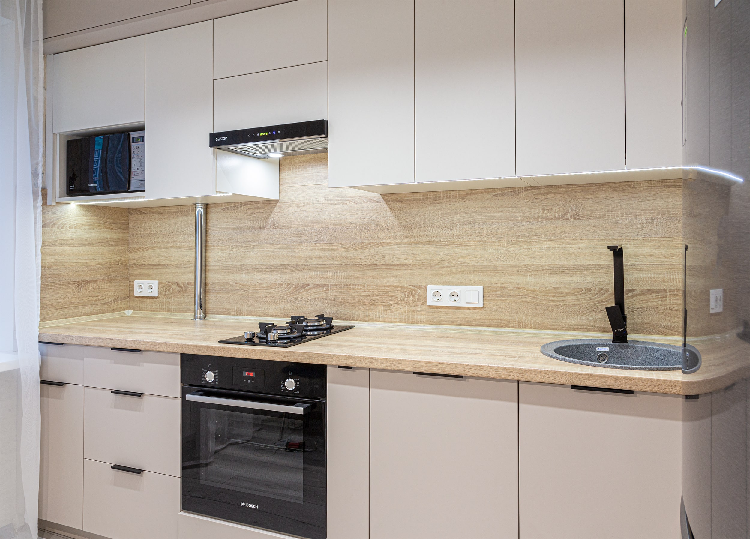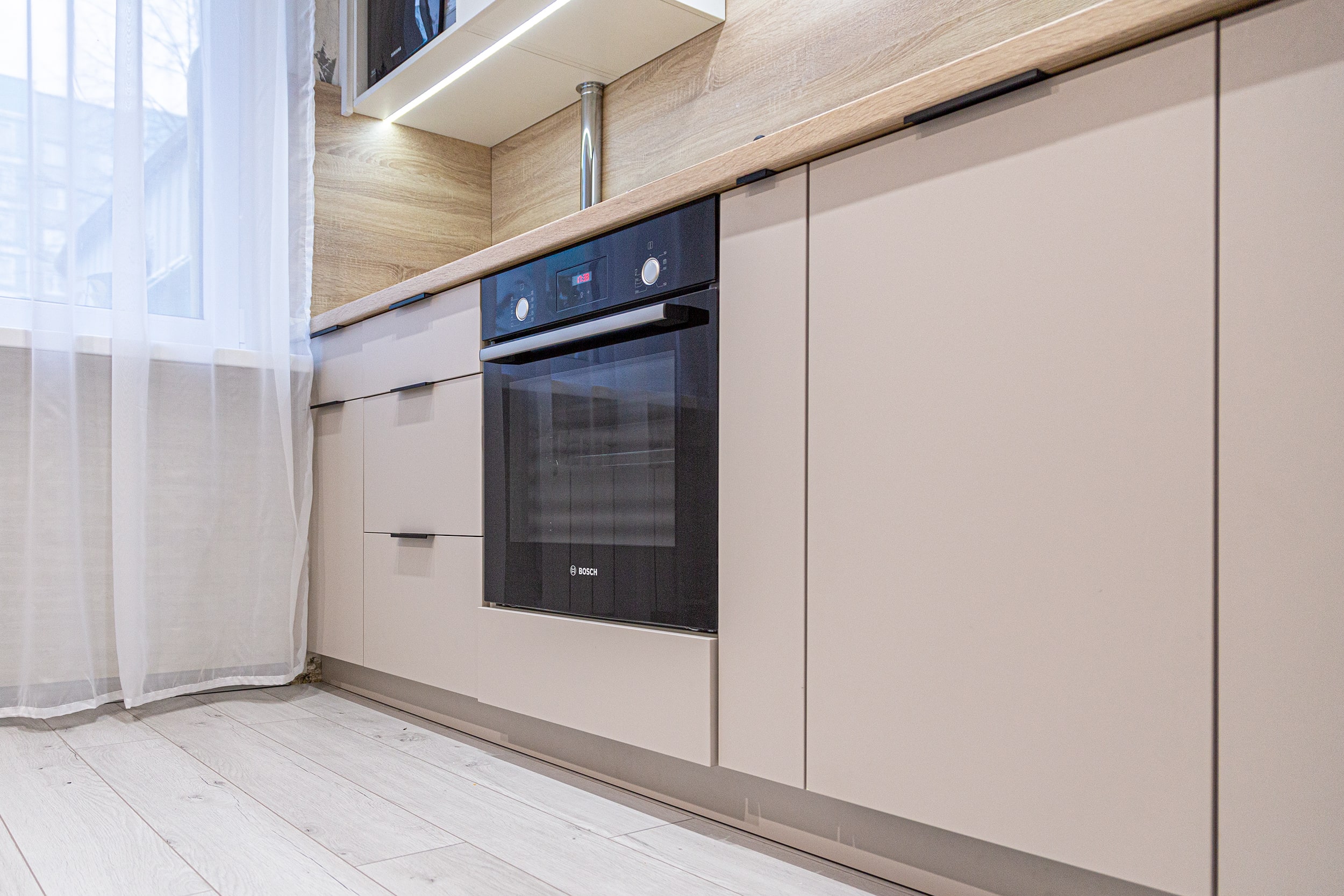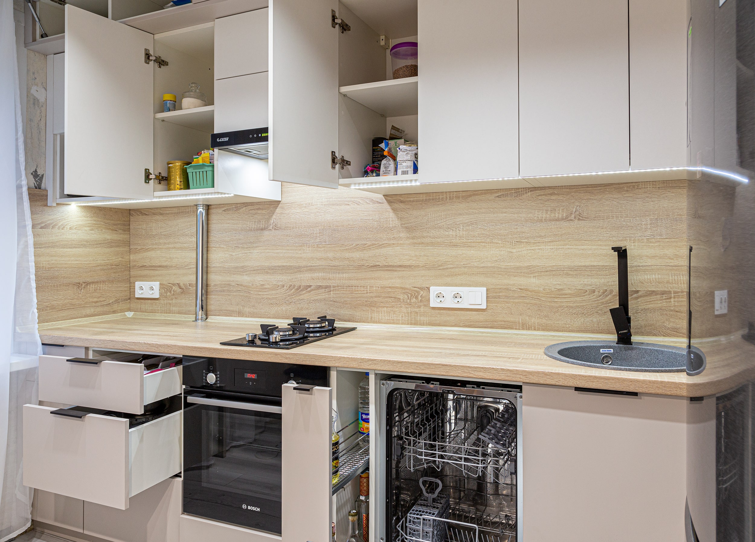 Разработка эргономичного проекта кухни вместе с профессионалом, подбор фурнитуры и материалов. Окончательный расчет стоимости.